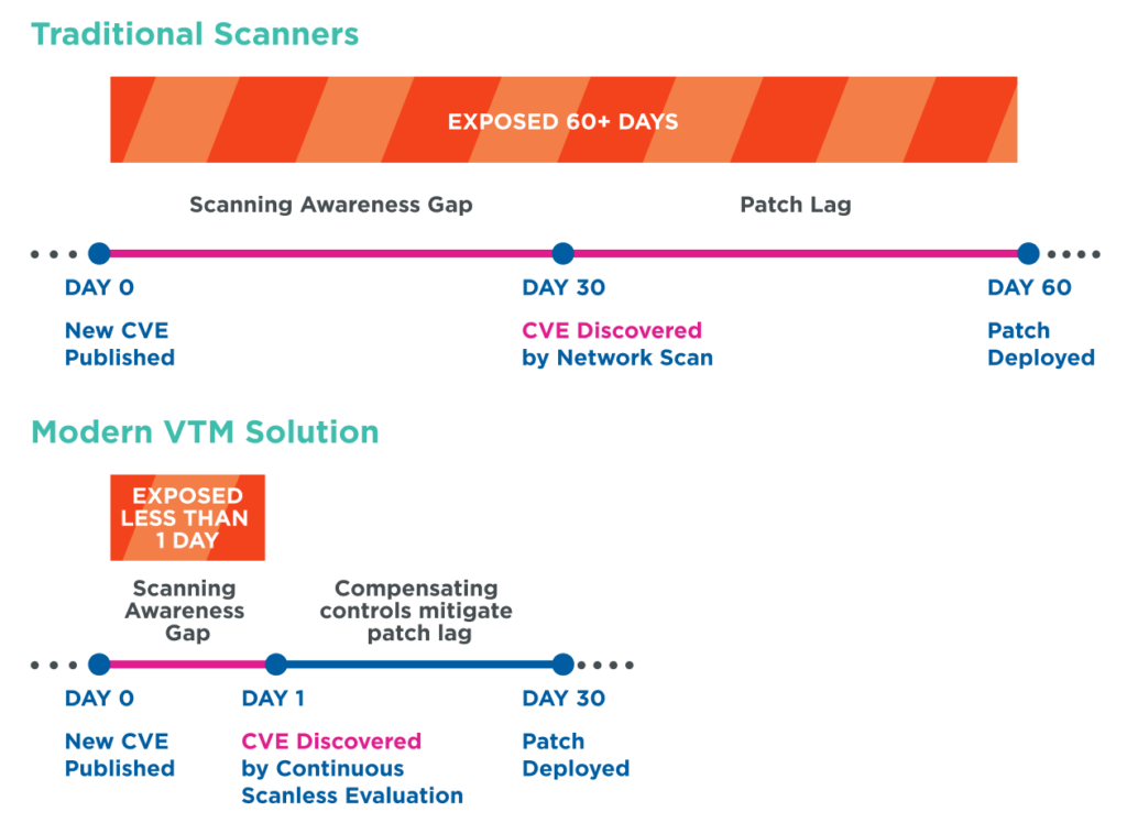 Unfortunately, most security teams only run periodic vulnerability scans; this leaves a long interval between scans and creates a substantial scanning awareness gap. Threats can go undetected for days, weeks, or even months, leaving cybercriminals a lot of time to lurk in your environment and cause significant damage. Even when a vulnerability is discovered, lengthy patch cycles for remediation subject organizations to an exposure gap of prolonged risk.