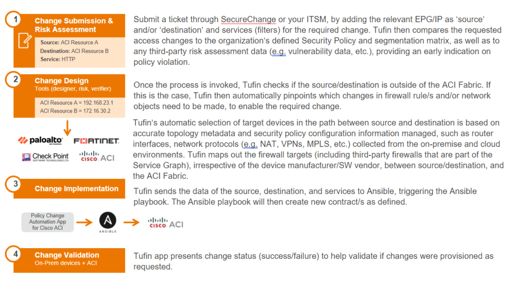 The Tufin Policy Change Automation app for Cisco ACI can be integrated into your ITSM workflows to trigger a change within and across your ACI Fabric. Subject to how you design your ITSM process, the Tufin app can trigger a full implementation notification sent directly from the Tufin app to the ITSM.