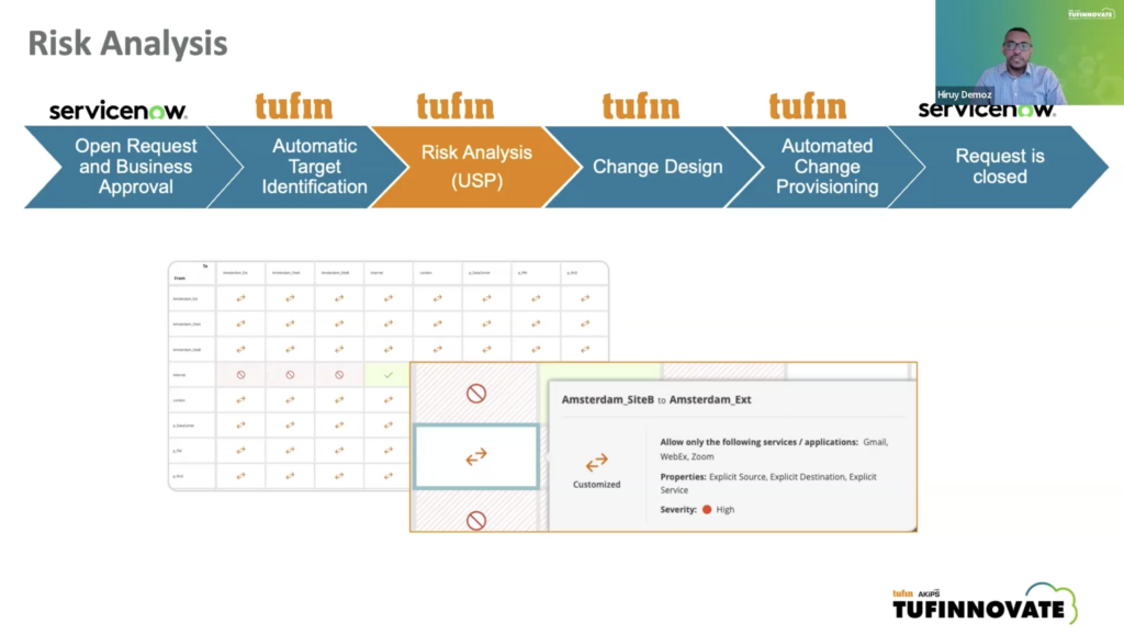 - From there, Johnson Controls started to work with Tufin to automate the provisioning of new firewall rules, with direct integration between Tufin and ServiceNow allowing the company to automatically determine how new firewall rules should be applied. The company also used Tufin’s Unified Security Policy (USP) to automate risk analysis of what kinds of traffic is allowed between zones on its network and implement network changes based on that analysis automatically.