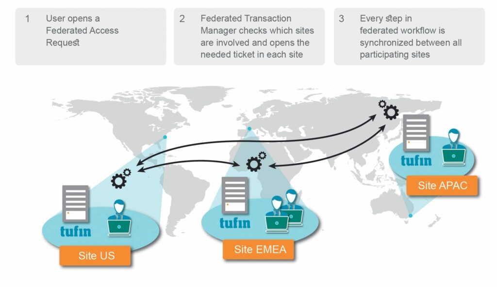 Tufin bietet eine föderierte Bereitstellungsoption für hochgradig föderierte Unternehmen, die eine Datentrennung nach Geschäftseinheiten benötigen, aber dennoch eine Zusammenarbeit zwischen den Einheiten für die Änderungsautomatisierung benötigen. In diesem Modell verwaltet jede Geschäftseinheit ihre eigene Tufin-Bereitstellung (mit einer der oben genannten Bereitstellungsoptionen). Die Zusammenarbeit wird über das Backend unterstützt, um die Bearbeitung von End-to-End-Änderungen im gesamten Netzwerk zu automatisieren, ohne dass sensible Daten zwischen den Einheiten offengelegt werden.