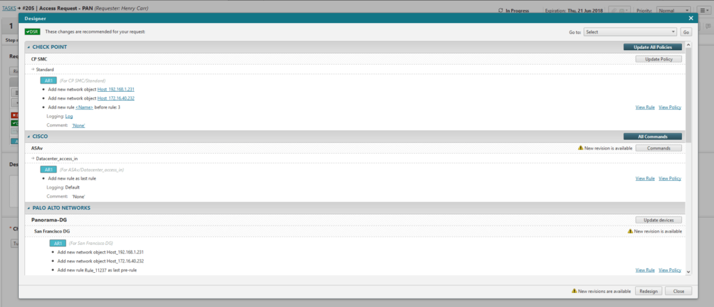 SecureChange’s automated workflows are extensible and customizable using open APIs. This approach allows full integration into enterprise ITSM processes. End-to-end automation and provisioning is supported for heterogeneous environments with a variety of devices and vendors including AWS, Check Point, Cisco, Forcepoint, Fortinet, Juniper and Palo Alto Networks.
