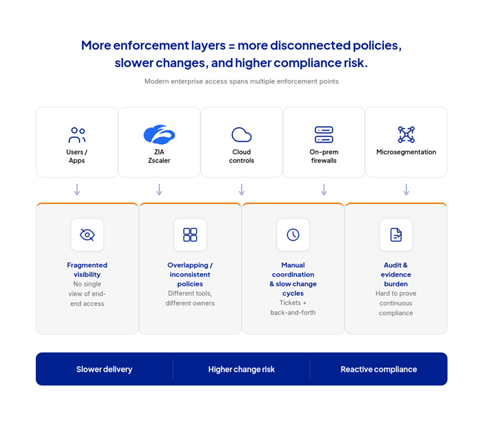 Managing multiple technologies independently across hybrid environments can introduce operational complexity and increase the effort required to maintain continuous compliance. Change requests may span multiple enforcement points, requiring teams to evaluate interactions across different environments. Additionally, maintaining continuous compliance requires visibility into how policies are applied end to end.