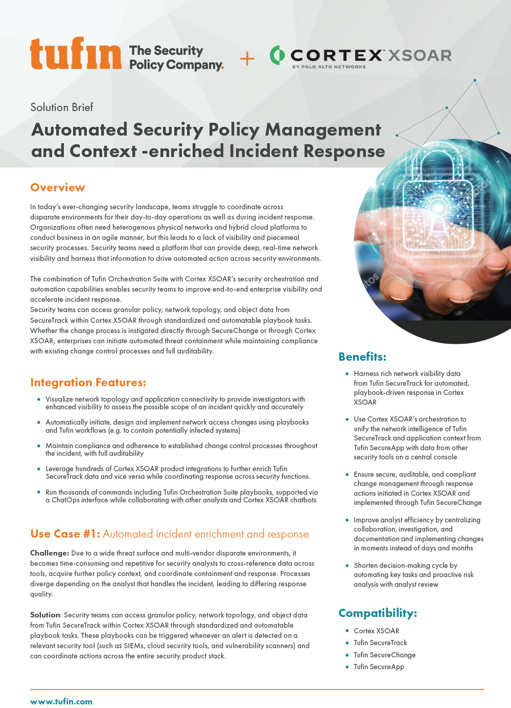 - Leverage hundreds of Cortex XSOAR product integrations to further enrich Tufin data and vice versa while coordinating response across security functions.