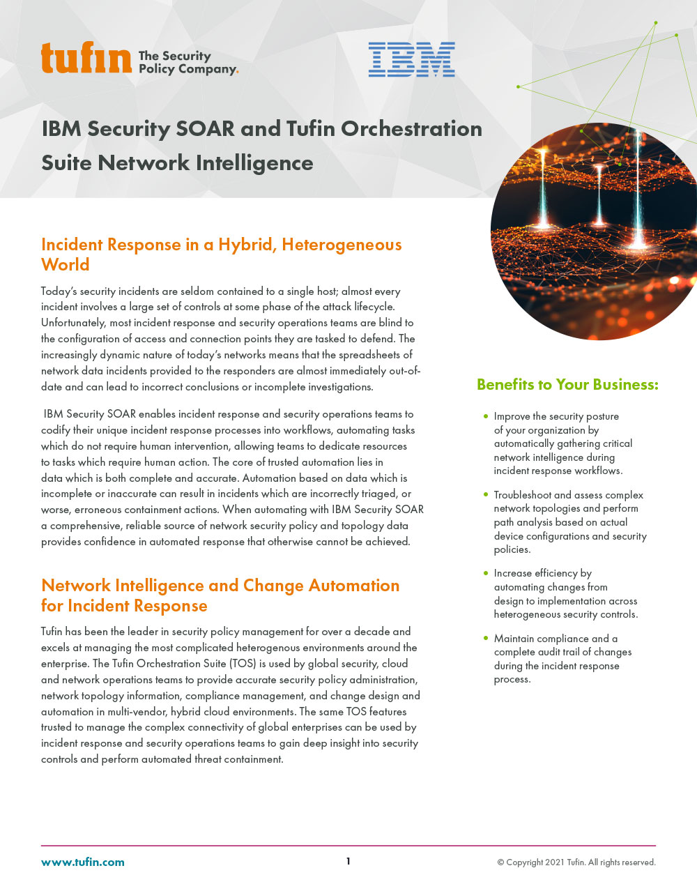 Tufin enriches SOAR playbooks with its unmatched network topology and connectivity intelligence. Details regarding the network access, path analysis, compliance status, device inventory and blast radius are some of the use cases that are made available as playbooks to IBM Security SOAR by Tufin, thus enabling the security analysts to correlate and view incidents from the viewpoint of the network.