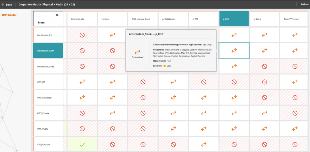 Tufin provides connectivity analysis based on its superior network topology modeling to enable rapid identification and troubleshooting of application downtime caused by blocked traffic. Tufin’s unique zone-to-zone Unified Security Policy (USP) matrix allows running risk analysis at the application level to alert on compliance violations.