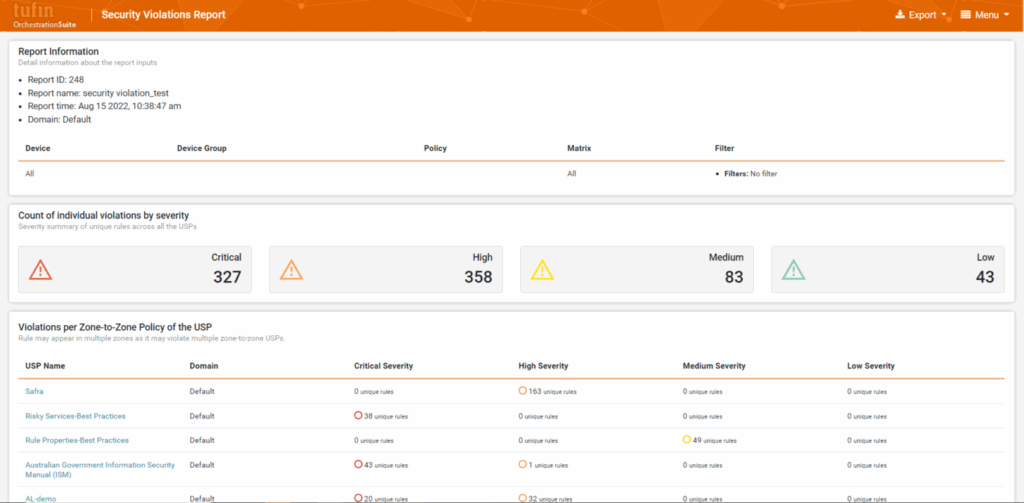 Compliance monitoring across thousands of network and cloud resources provides real-time risk awareness. Network teams can see risky access and firewall security policy violations in real-time from a central dashboard and receive alerts. The security policy monitoring solutions checks network changes against security/compliance policies, prioritizing violations by criticality.