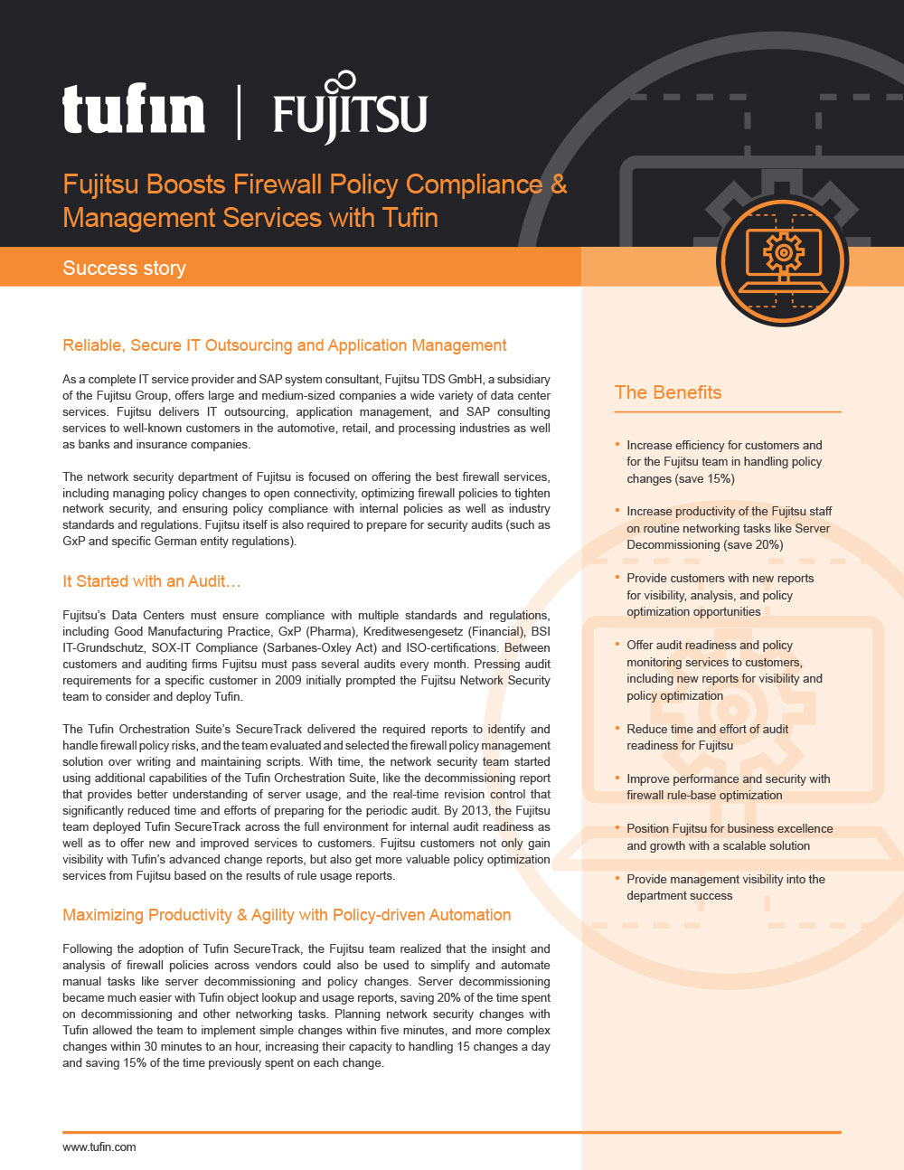 Tufin adds value to our brand. We have end-customers who already know Tufin and request the Orchestration Suite and its reports… Implementing smaller changes now takes us about five minutes, larger changes about half an hour, depending on the size and complexity of the change.